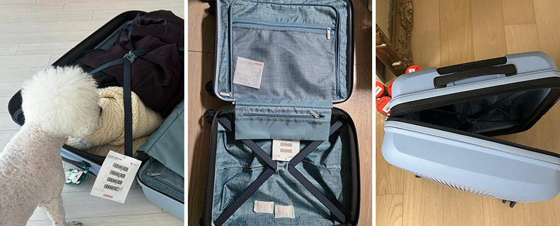 상품을 딱 받아서 개봉할 때 너무 가벼워서 놀랬습니당 ㅎㅎ 제일 큰 사이즈인데도 불구하고 이렇게나 가볍다고? 하면서 뜯었어용 ㅋㅋㅋㅋ 뜯자마자 일단 하자가 있는지 상태 확인부터 하고 하나하나씩 보는데 바퀴도 스무스하고 안에도 고급스럽고 색이 무엇보다 너무 이쁘더라구요! 제 남친도 같은 거 하늘색 샀는데 하늘색이 생각보다 실제로 보니 너무 이쁩디다..굿 곧 신혼여행 가는데 필요해서 둘다 큰거 하나씩 구매했는데 너무너무 잘 쓸 것 같아요! 실제로 캐리어를 써봐야 알겠지만 지금은 일단 만족도 5입니당!